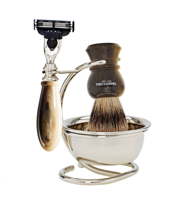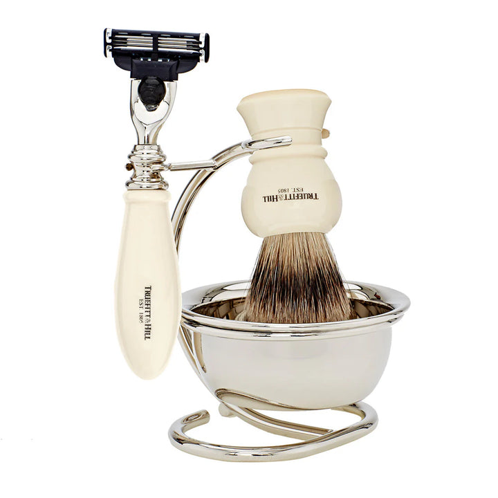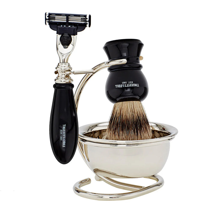 مجموعة حلاقة تقليدية بتصميم ريجنسي الكلاسيكي، تتضمن ماكينة حلاقة Mach III متوازنة بدقة، وفرشاة حلاقة يدوية الصنع من شعر الغرير الفاخر، وقاعدة أنيقة من الكروم مع وعاء مخصص لتكوين رغوة غنية ومثالية لعشّاق الحلاقة الرطبة. خيار مثالي لإضفاء لمسة راقية على خزانة حمامك.