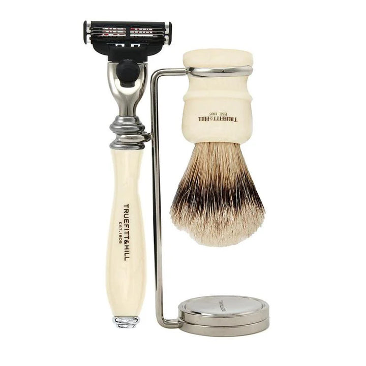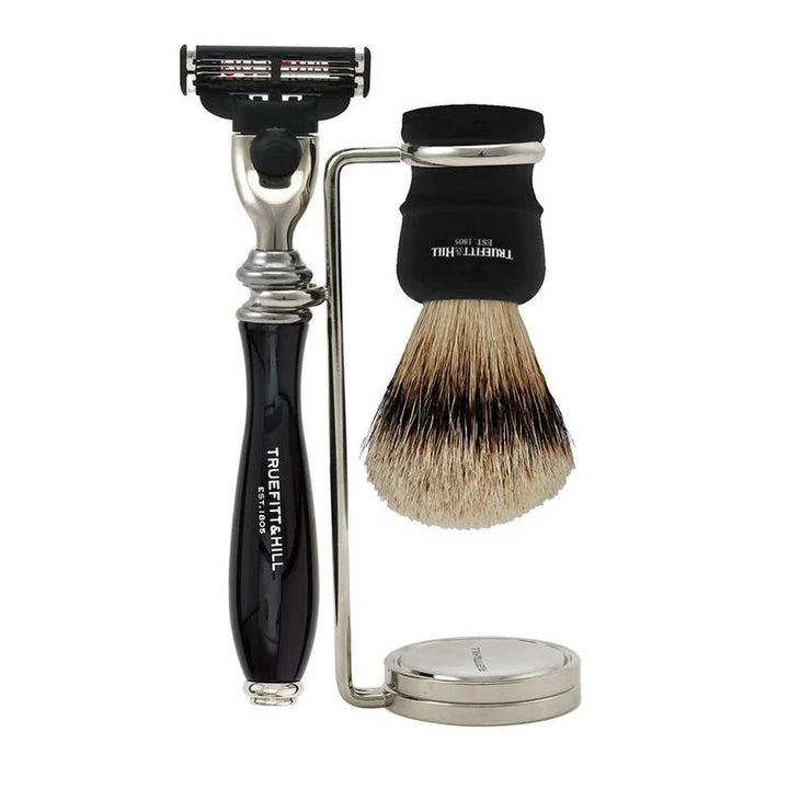 مقابض الفرشاة والماكينة مصنوعة من الراتنج الفاخر، متوفرة بأربعة ألوان: إبنوسي، عاجي، أزرق أوبال صناعي، وقرن صناعي لون بني، مع لمسات نهائية من الكروم. الحامل مصنوع من الفولاذ المطلي بالكروم.